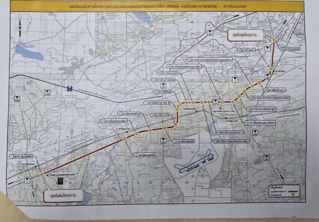 ทั้งนี้ โครงการระบบขนส่งมวลชนจังหวัดนครราชสีมา “สายสีส้ม” ช่วงโรงพยาบาลเทพรัตน์-สถานีร่วมจอหอ มีระยะทาง 18.9 กิโลเมตร ประกอบด้วย 1.สถานีโรงพยาบาล เทพรัตน์ (จุดเริ่มต้น) 2.สถานีตลาดเทิดไท 3.สถานีโรงเรียนราชสีมาวิทยาลัย 4.สถานีตลาดเซฟวัน 5.สถานีสามแยกปักธงชัย 6.สถานีโรงแรมสีมาธานี 7.สถานีชุมชนมิตรภาพซอย 8 8.สถานีซิตี้ลิงค์ 9.สถานีกิ่งสวายเรียง 10.สถานีเดอะมอลล์ 11.สถานีวิทยาลัยเทคนิคนครราชสีมา 12.สถานีร่วมศูนย์การค้าเทอมินอล21โคราช 13.สถานีโรงเรียนเมืองนครราชสีมา 14.สถานีโรงเรียนสุรนารีวิทยา 15.สถานีร่วมทางแยกประตูน้ำ 16.สถานีมหาวิทยาลัยราชภัฏนครราชสีมา 17.สถานีมหาวิทยาลัยราชมงคล (มทร.) อีสาน 18.สถานีไนท์บ้านเกาะ 19.สถานีองค์การบริหารส่วนตำบล (อบต.) บ้านเกาะ 20.สถานีร่วมจอหอ (จุดสิ้นสุดโครงการ)