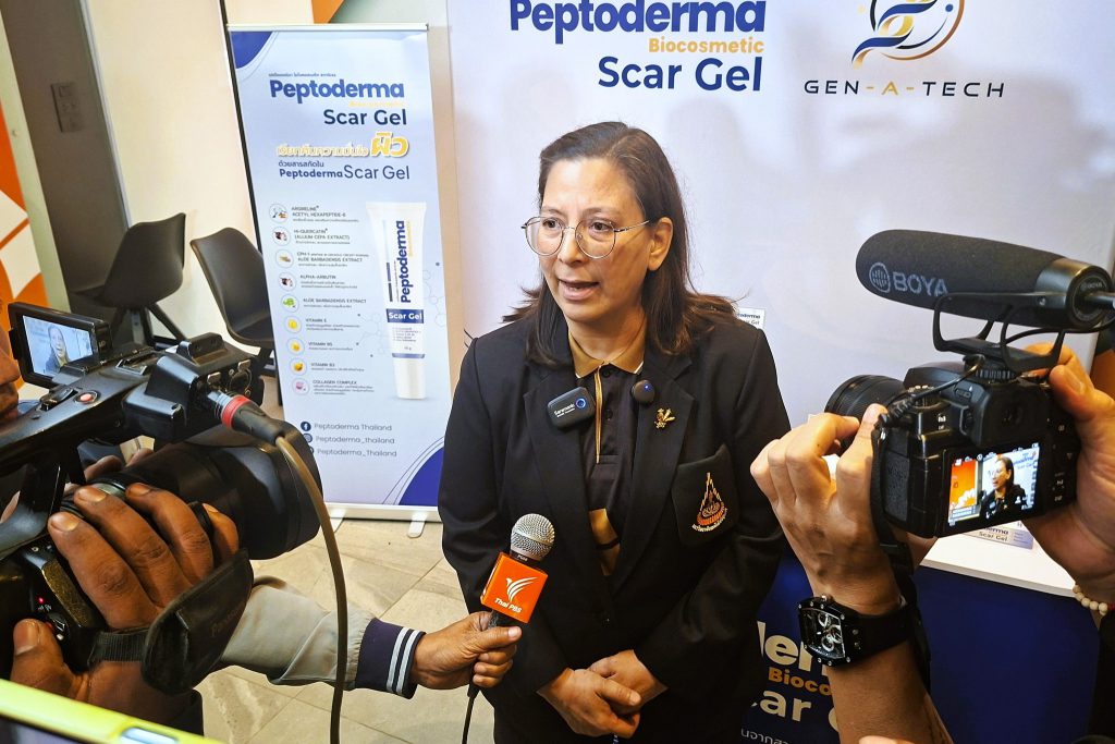 นายพชร เชิดชัย หนึ่งในทีมสตาร์ทอัพ บริษัท เจ็น-เอ-เทค จำกัด  ผู้รับการถ่ายทอดเทคโนโลยี กล่าวว่า “ผลิตภัณฑ์ Peptoderma Biocosmetic Scar Gel เป็นนวัตกรรมเด่นที่ค้นพบว่า โปรตีนในจิ้งหรีด เมื่อผ่านกระบวนการสกัดและย่อยด้วยกระบวนการทางเทคโนโลยีชีวภาพ จะให้เปปไทด์ออกฤทธิ์ทางชีวภาพ (Bioactive Peptide) ซึ่งมีคุณสมบัติสำคัญต่อการฟื้นฟูผิว ได้แก่ การกระตุ้นการสร้างคอลลาเจนใหม่ การลดการอักเสบของผิว และช่วยให้กระบวนการสมานแผลเกิดขึ้นอย่างมีประสิทธิภาพมากขึ้น”