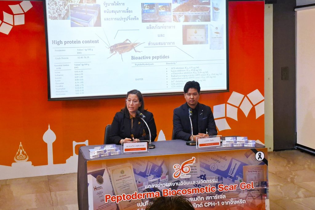 มหาวิทยาลัยเทคโนโลยีสุรนารี (มทส.) ร่วมกับทีมสตาร์ทอัพ  เจ็น-เอ-เทค เปิดตัวผลงานวิจัยและนวัตกรรม “Peptoderma Biocosmetic Scar Gel” หรือ “เปปโตเดอร์มา ไบโอคอสเมติก สการ์เจล” เจลลดรอยแผลเป็นที่พัฒนาจากเปปไทด์ชีวภาพจิ้งหรีดไทย พบคุณสมบัติช่วยลดการอักเสบ กระตุ้นการสร้างคอลลาเจน เร่งการฟื้นฟูผิวอย่างมีประสิทธิภาพ ยับยั้งการเจริญเติบโตของแบคทีเรีย เหมาะสำหรับผิวบอบบางแพ้ง่าย ด้วยคุณสมบัติที่พิเศษหลากหลาย สามารถต่อยอดเป็นนวัตกรรมเวชสำอางมีศักยภาพเชิงพาณิชย์สูง ในตลาดระดับประเทศและนานาชาติได้ในอนาคต